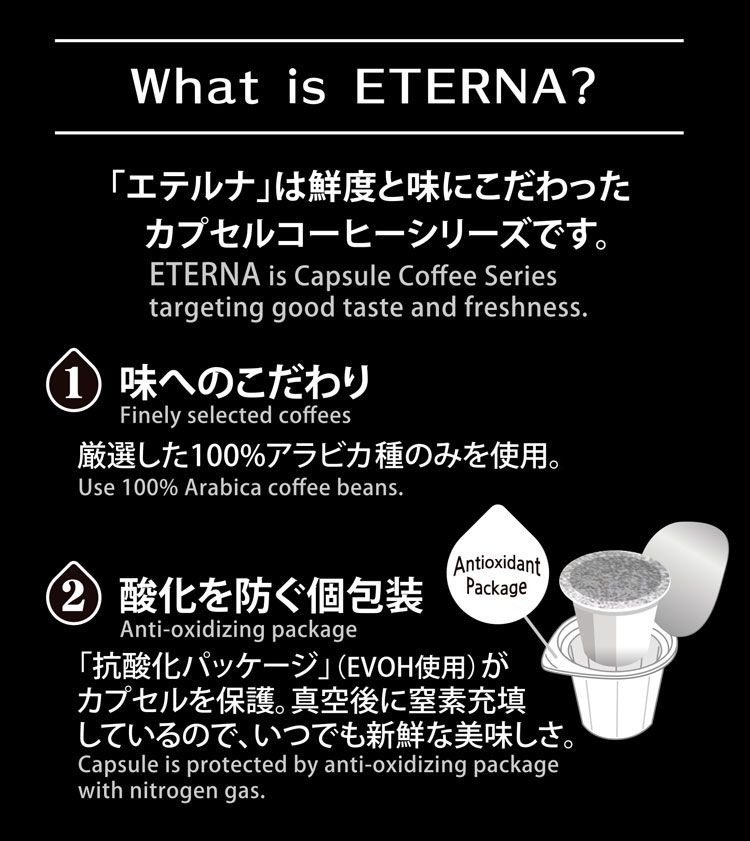 ETERNA(エテルナ)は珈琲問屋オリジナルの 厳選した100%アラビカ種のみを使用した 一杯用ネスプレッソ互換カプセルコーヒーです。