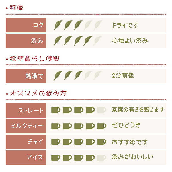 原材料:紅茶 茶葉原産国:ケニア 茶葉の種類:CTC BP1 水色:深みのある透き通った濃い橙色 茶葉の量:ティースプーン 平盛り(2グラム)